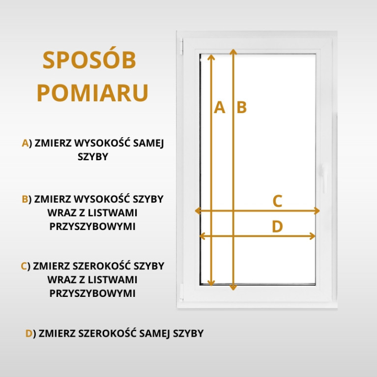 UWAGA: Aby poprawnie zrobić pomiar należy zmierzyć szerokość szyby okna wraz z listwami przyszybowymi w 3 miejscach ponieważ zdarza się że okna są nierówne oraz wysokość całej ramy.